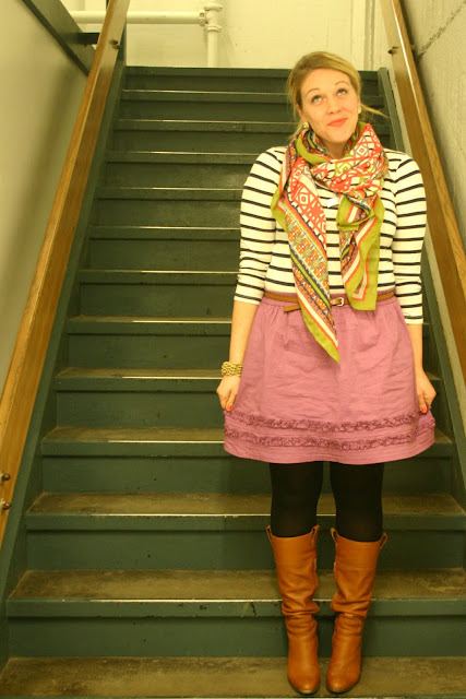 {J.Crew Stripe Tee; Gifted Print Scarf; Target Belt; Old Navy Skirt; Target Tights; Banana Republic Boots; Stell & Dot Earrings, Loft Bracelet & Revlon Siren Orange Lips}